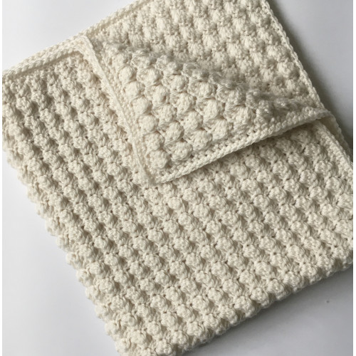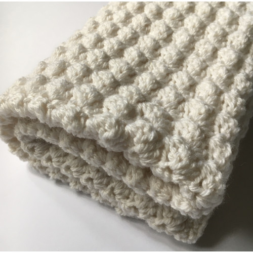 CUDDLE baby blanket in light cream. Hand crocheted in a pretty 3D stitch for warmth, super soft and cosy. Machine washable at 30 degrees, dry flat, 30% merino wool, 70% premium acrylic. Size: 76cm x 70cm