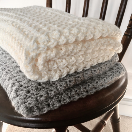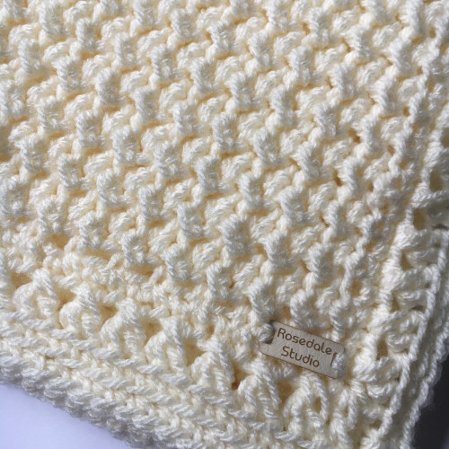 HUG cream baby blanket. A medium-weight super soft blanket in classic cream. Hand crocheted in a textured lace stitch with a decorative border. Machine wash, tumble dry. Size: 95cm x 85cm
