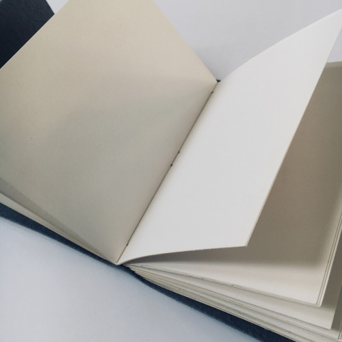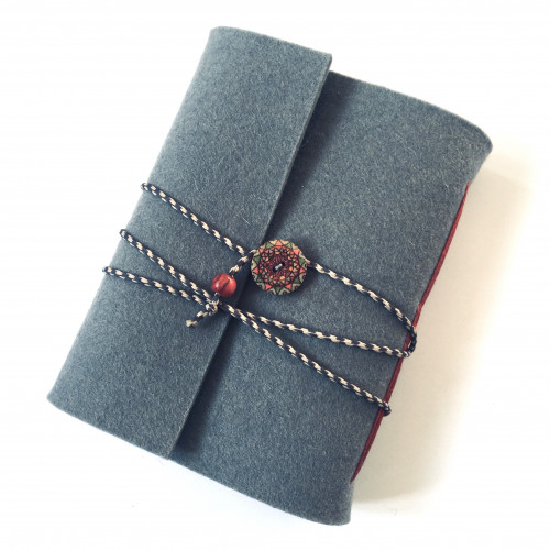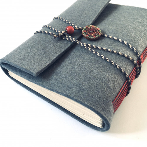 NOTEBOOK hand bound in grey felt. Grey wool felt covers with decorative red silk stitching and cord closure, wooden button and bead. Inside are 48 plain pages of hand cut, heavy quality cream cartridge paper. Size: 15cm x 13cm