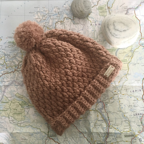 Cameo hat, hand crocheted in textured stitch with pompom. Soft and warm in a chunky yarn with merino wool. Flattering warm pinky beige colour.